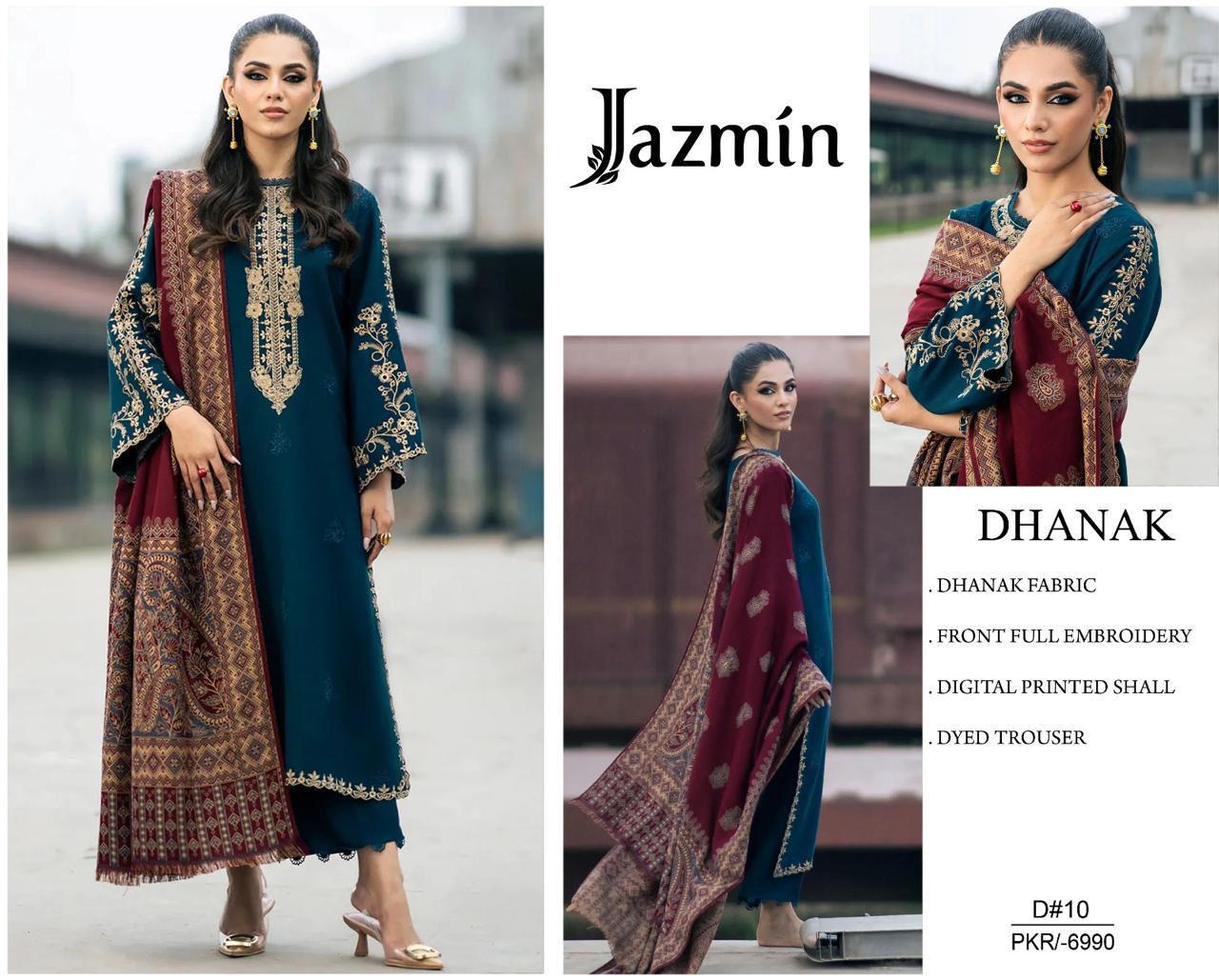 Jazmin Dhanak 3 Pc Embroidery with wool shawl