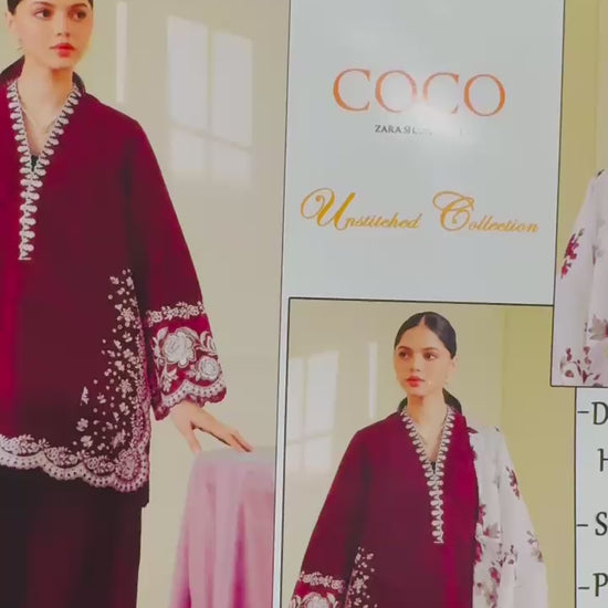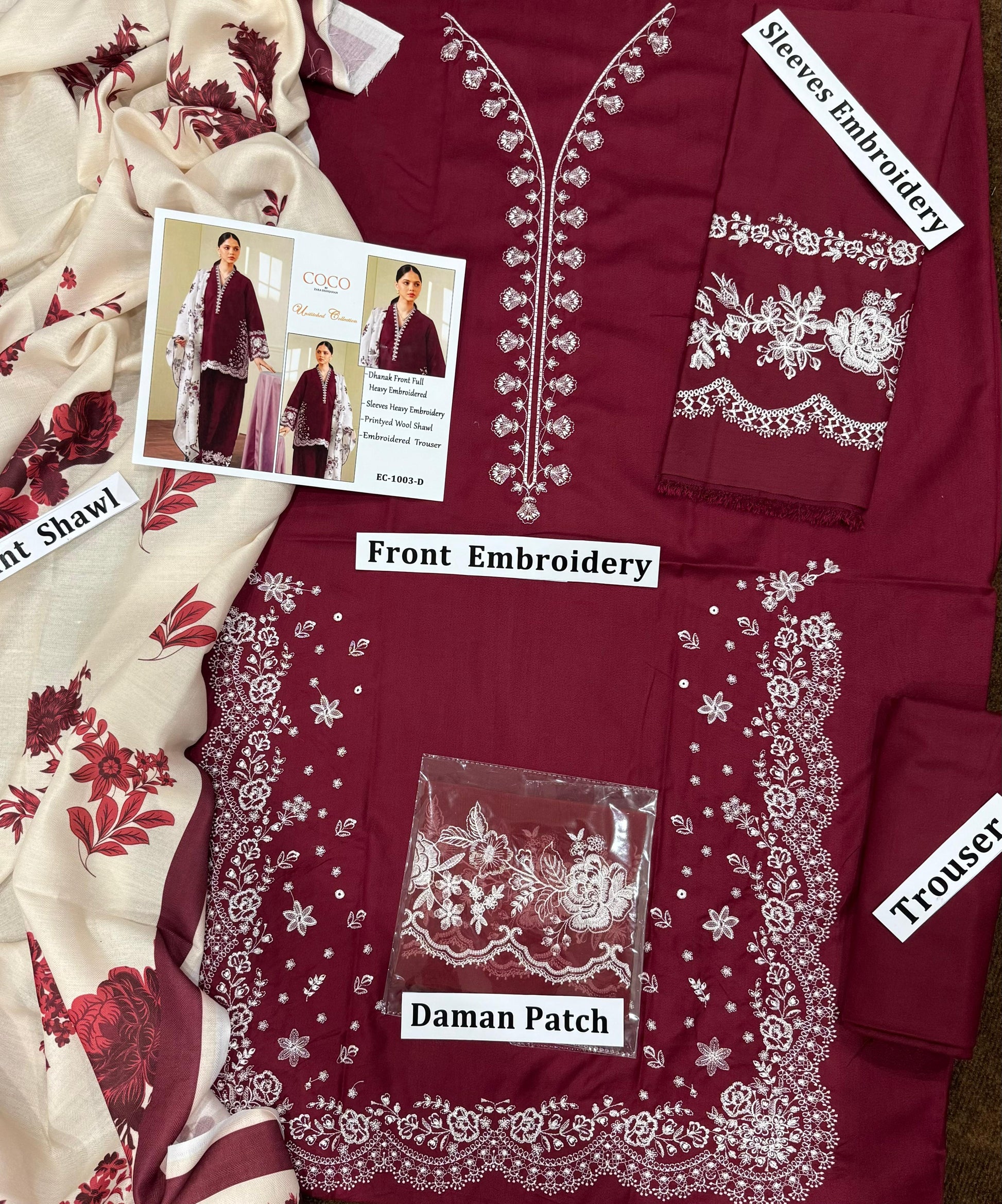 ● Unstitched Winter Collection Dhanak Stuff 3 Piece Full Embroidered Suit With Wool Shawl.